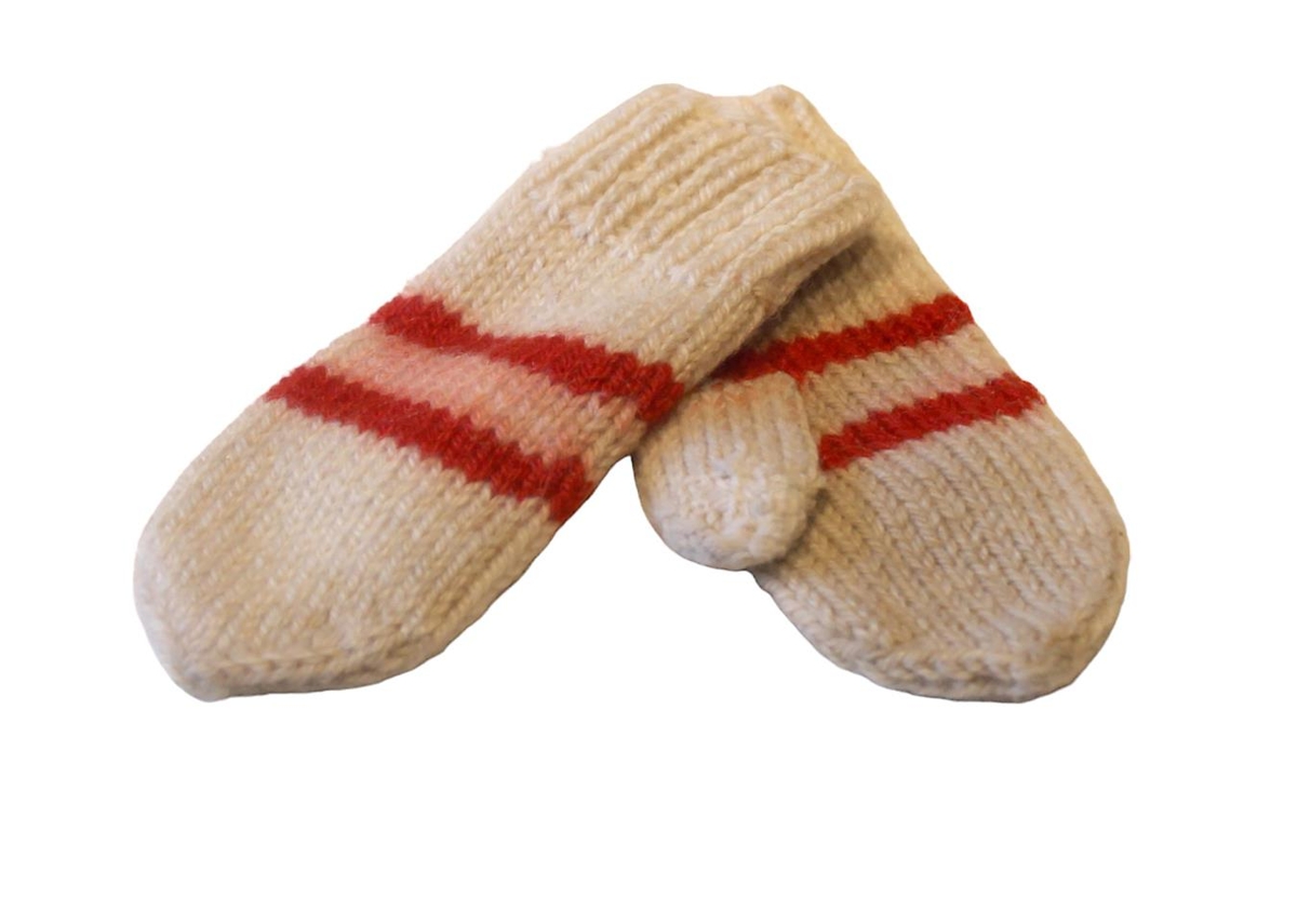 Hvítir barnavettlingar með tveimur rauðum röndum á.