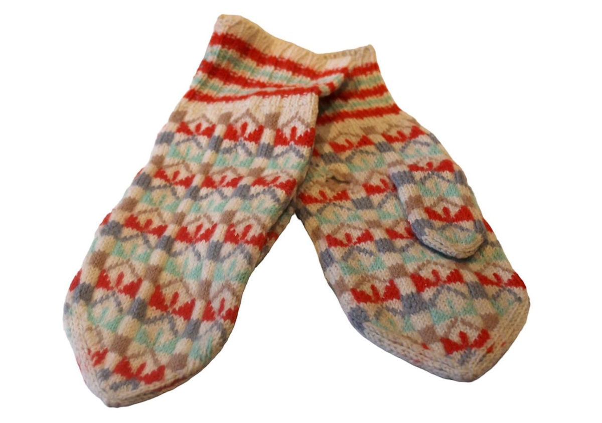 Hvítir vettlingar með rauðu, ljósblá, ljósbrúnni og ljósgrænu munstri. Sést að hafa verið notaðir og komið gat á hægri vettling