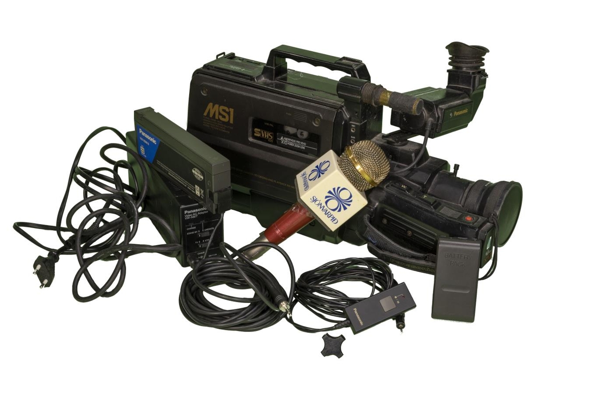 Panasonic MS1 myndbandsupptökuvél með straumbreyti, rafhlöðum og hljóðnema.