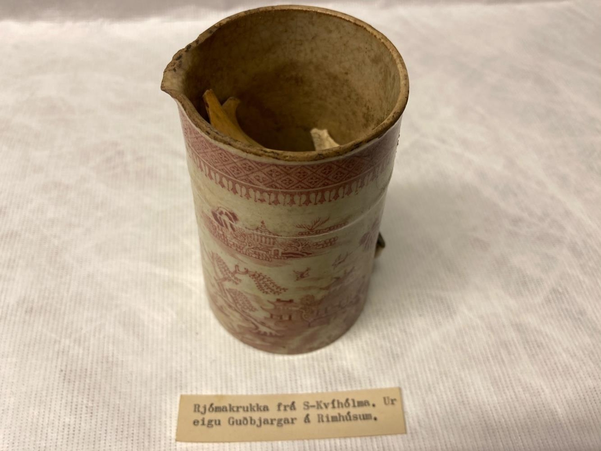 Rjómakrukka úr leir, brotið af haldið. Hvít í grunninn með rauðu mynstri með kínversku myndamynstri. Var í eigu Guðbjargar Guðmundsdóttur frá Rimahúsum, mun gömul.
