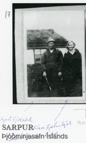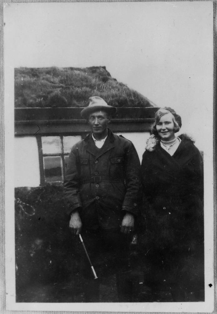 Karl og kona við hús með torfþaki. Ágúst Fjeldsted og Klara Hjálmtýsdóttir. Tekið við Mellandsbæ. (Þór Magnússon)