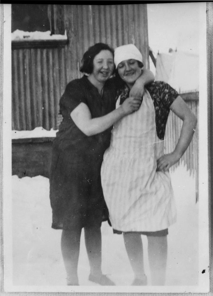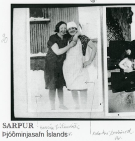 Tvær konur við hús að vetri til. Halldóra Þórðardóttir t.v. og Valgerður Þorsteinsdóttir t.h.