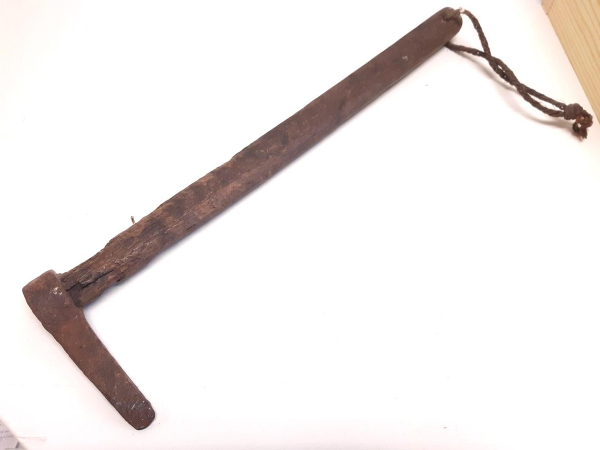Fýlaklappa, með skafti og hamphanka. Notuð lengi af gefanda við bjargsig í Fagradalshömrum. Áður fyrr var hankinn venjulega úr ósútaðri leðurreim, sem fljótt varð mjúk af fýlafitu. Gefið af Ólafi Jakobssyni frá Fagradal.