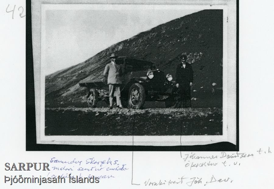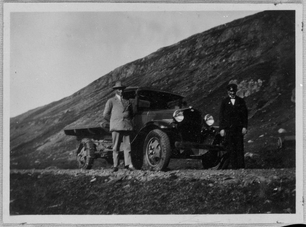 Tveir karlmenn standa sitt hvoru megin við vörubíl, Ford árgerð 1931. Bíllinn er með keðjur á afturhjólum. T.v. Sæmundur Skarphéðinsson smiður og t.h. Jóhannes Davíðsson vörubifreiðarstjóri.