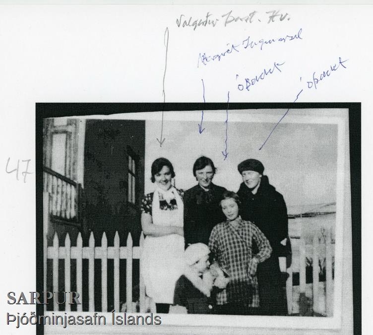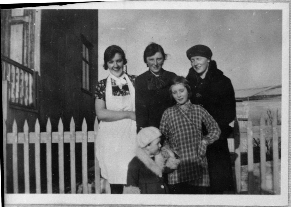 Hópur ungra kvenna við grindverk við garð. T.f.v.: Valgerður Anna Þorsteinsdóttir, Margrét Ingimarsdóttir, Karín Kristín Blöndal og Helga Sigríður Blöndal. Telpan er óþekkt.