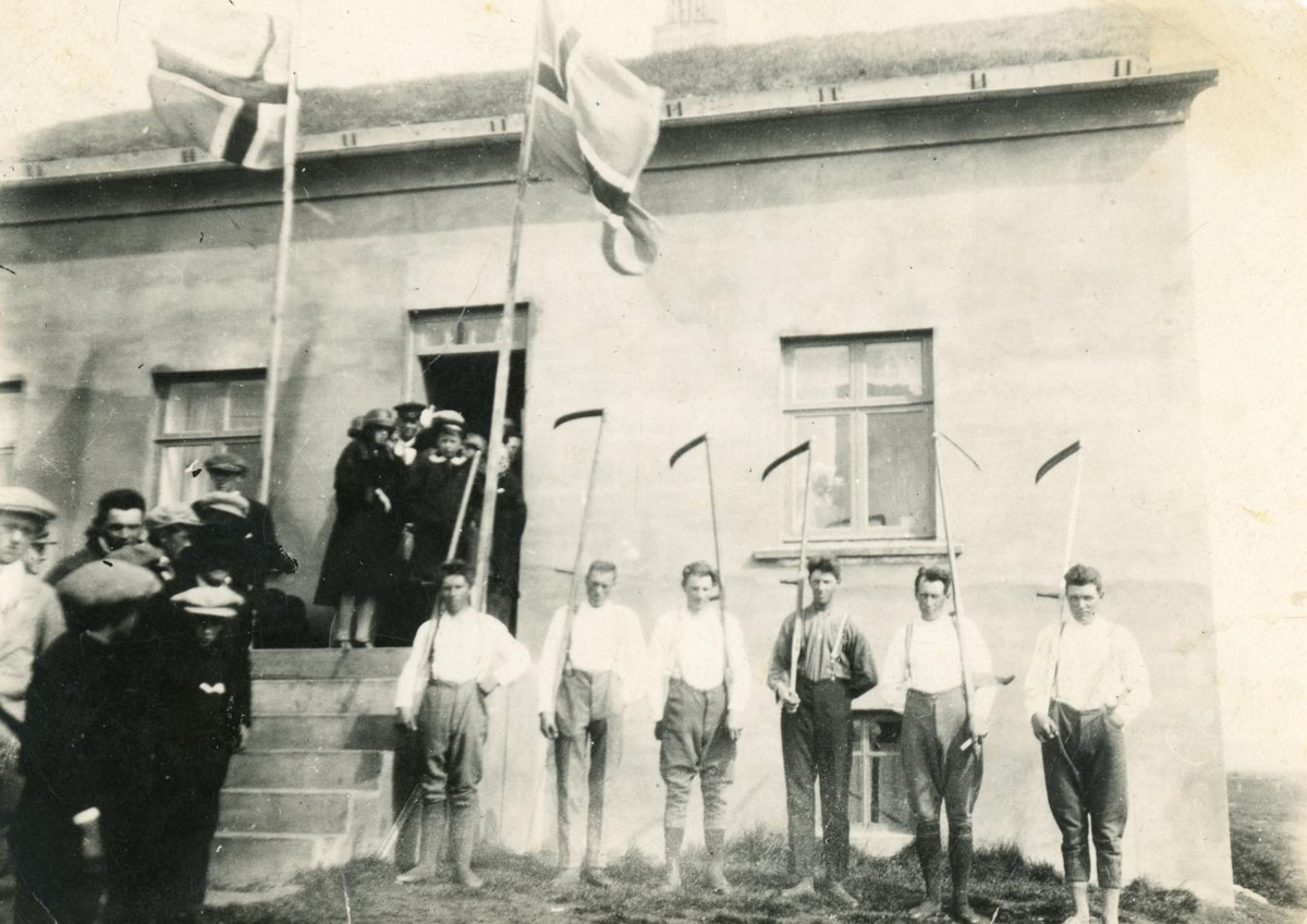 Samkoma Ungmennafélagsins Ólafs páa við Sólvang í Búðardal. Sláttumenn raða sér upp.