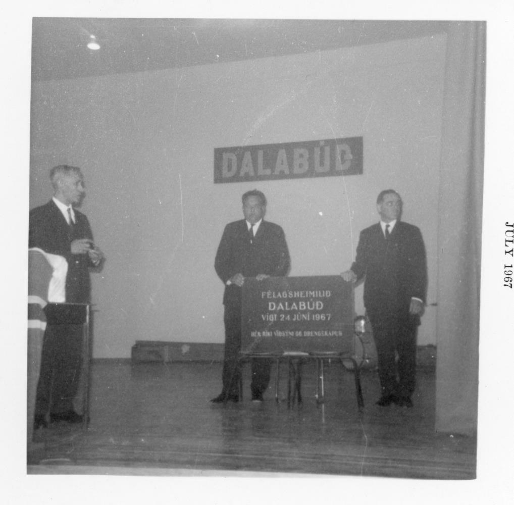 Vígsla félagsheimilisins Dalabúðar laugardaginn 24. júní 1967. Að byggingunni stóðu Laxárdalshreppur, Kvenfélagið Þorgerður Egilsdóttir, Ungmennafélagið Ólafur pái og Búnaðarfélag Laxárdalshrepps.