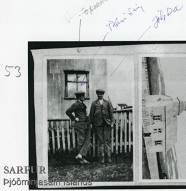 Tveir karlmenn standa við grindverk, bárujárnsklætt hús bakvið.