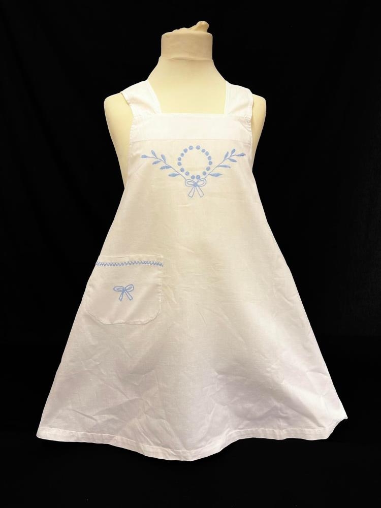 Hvít svunta með bláum útsaumi, blómsveigur - lauf. Einn vasi á hlið. Saumuð í 6. bekk í Barnaskóla Akureyrar.