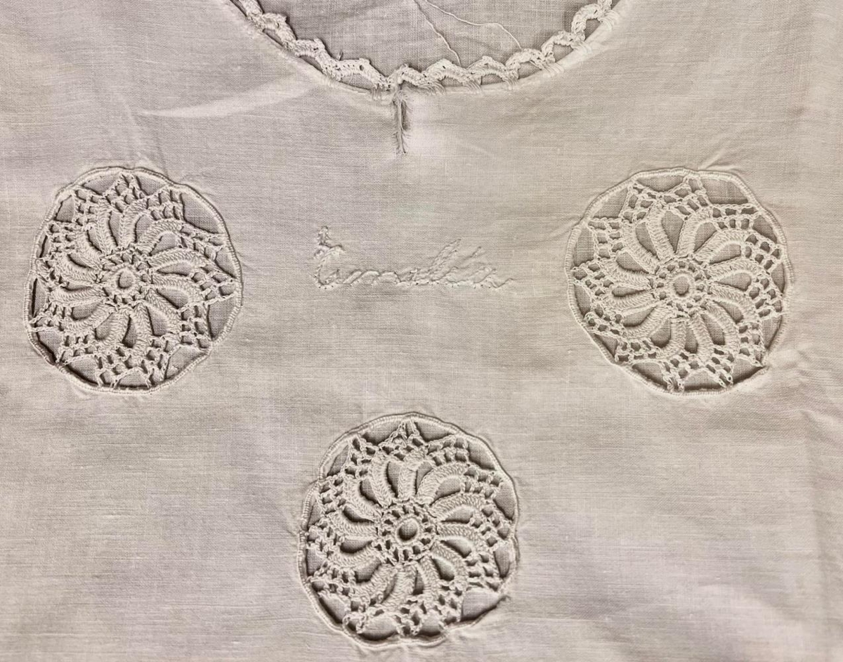 Hvítur skokkur, undirkjóll eða náttkjóll? Útsaumaðir þrír hringir á bjrósti og ofan til fyrir miðju er saumað nafnið, Emelía.