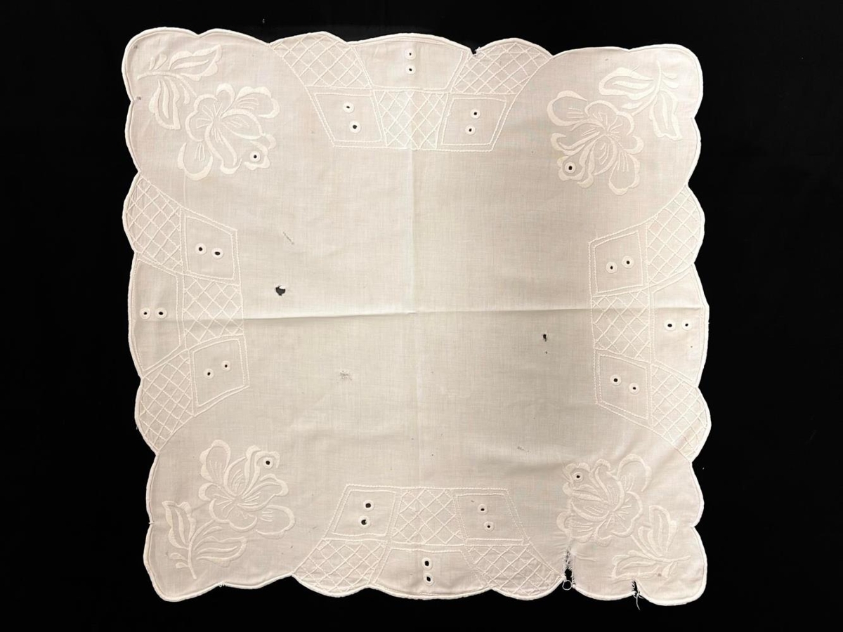 Ferkantaður hvítur dúkur með útsaumuðum blómum í hornum og breiðu munstri meðfram köntum.