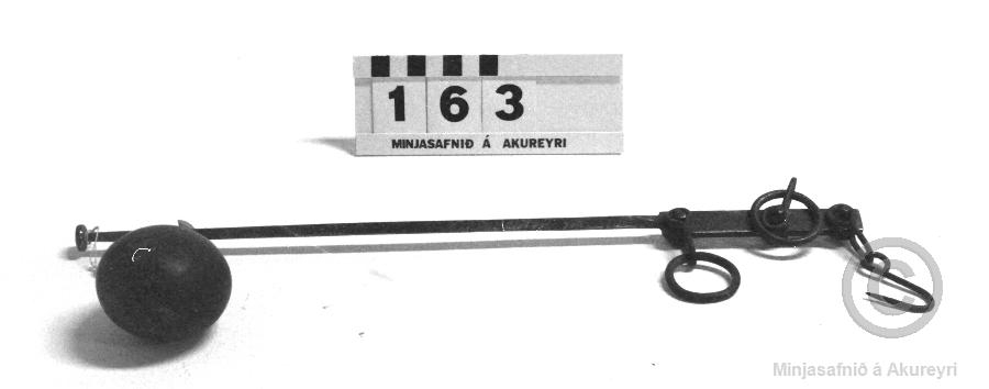 með kringlóttu, dálítið flötu steinlóði. Tveir hringir og einn krókur.