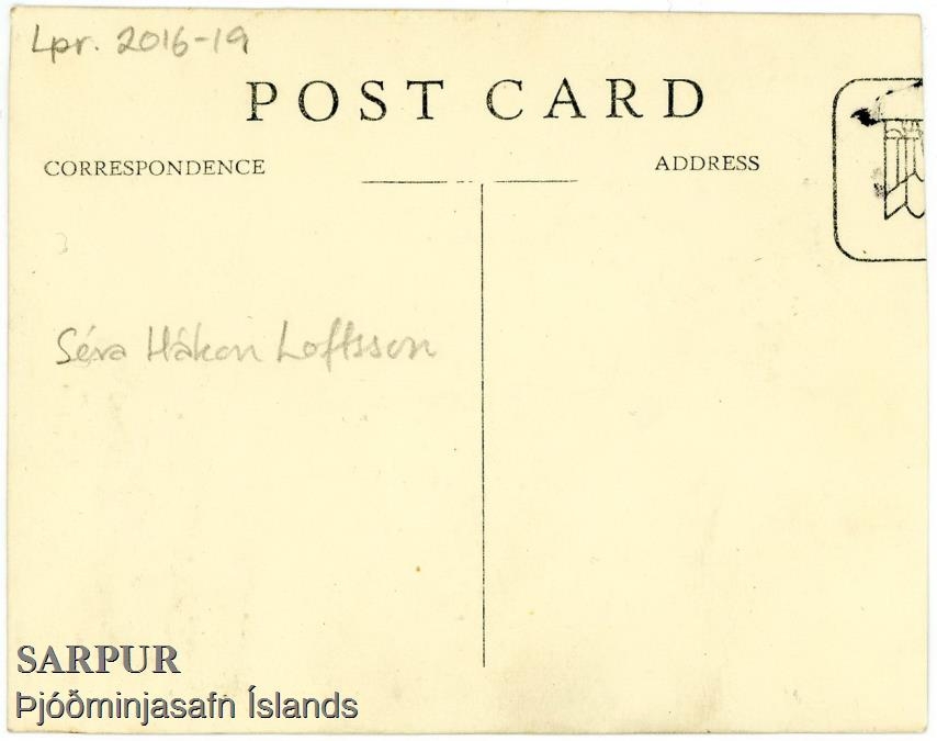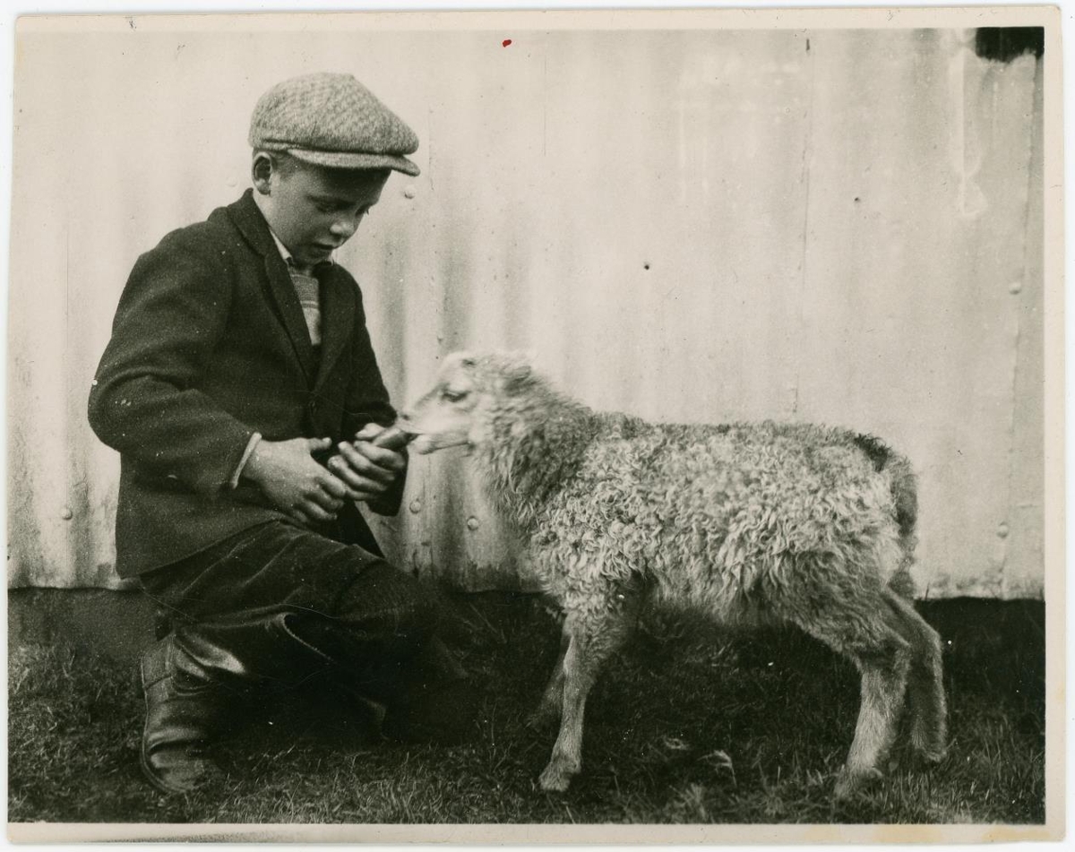 Strákur með derhúfu gefur heimaalningi að drekka úr pela. Á bakhlið er skrifað: Séra Hákon Loftsson.