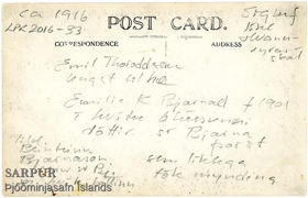 Á bakhlið er skrifað: ca. 1916. Siglufjörður, líklega Hvanneyrarskál. Emil Thoroddsen lengst t.h.. Emilía K Bjarnadóttir, f. 1901, í hvítu blússunni, dóttir sr. Bjarna Þorsteinssonar sem líklega tók myndina. Líklega Beinteinn Bjarnason sonur sr. Bjarna, með hvíta hattinn.