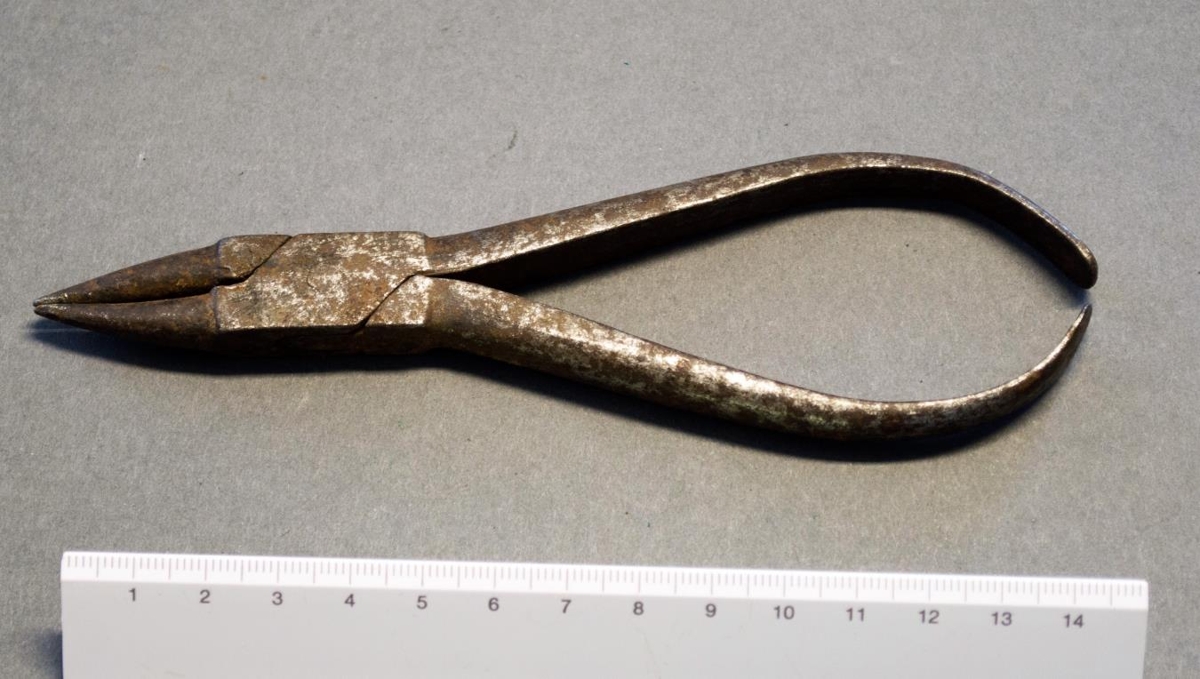 Beygjutöng (klípitöng). Gripir úr dánarbúi Guðrúnar Eyjólfsdóttur frá Fjósum í Mýrdal, flestir úr eigu þjóðhagans föður hennar, Eyjólfs Jónssonar.