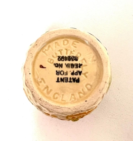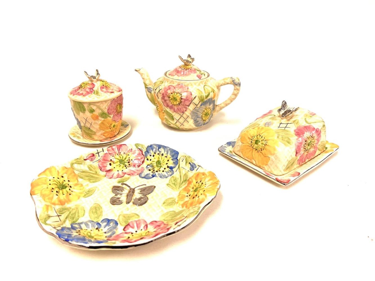 Tekanna, smjörkúpull og sultukar ásamt disk. Sett með upphleyptu blómamunstri. Ljósgult í grunninn en með bleikum, bláum og gulum tónum í blómunum. Fiðrildi eru eins og haldföng á lokunum. Frá Valgerði Steinunni Friðriksdóttur og Jónasi Franklín Jóhannssyni (Foreldrar Jónasar voru Jóhann Franklín Jónasson bóndi á Öngulsstöðum, Syðra-Kálfskinni og Þverá í Eyjafirði og kona hans Þóra Rósa Vigfúsdóttir frá Árskógsströnd).