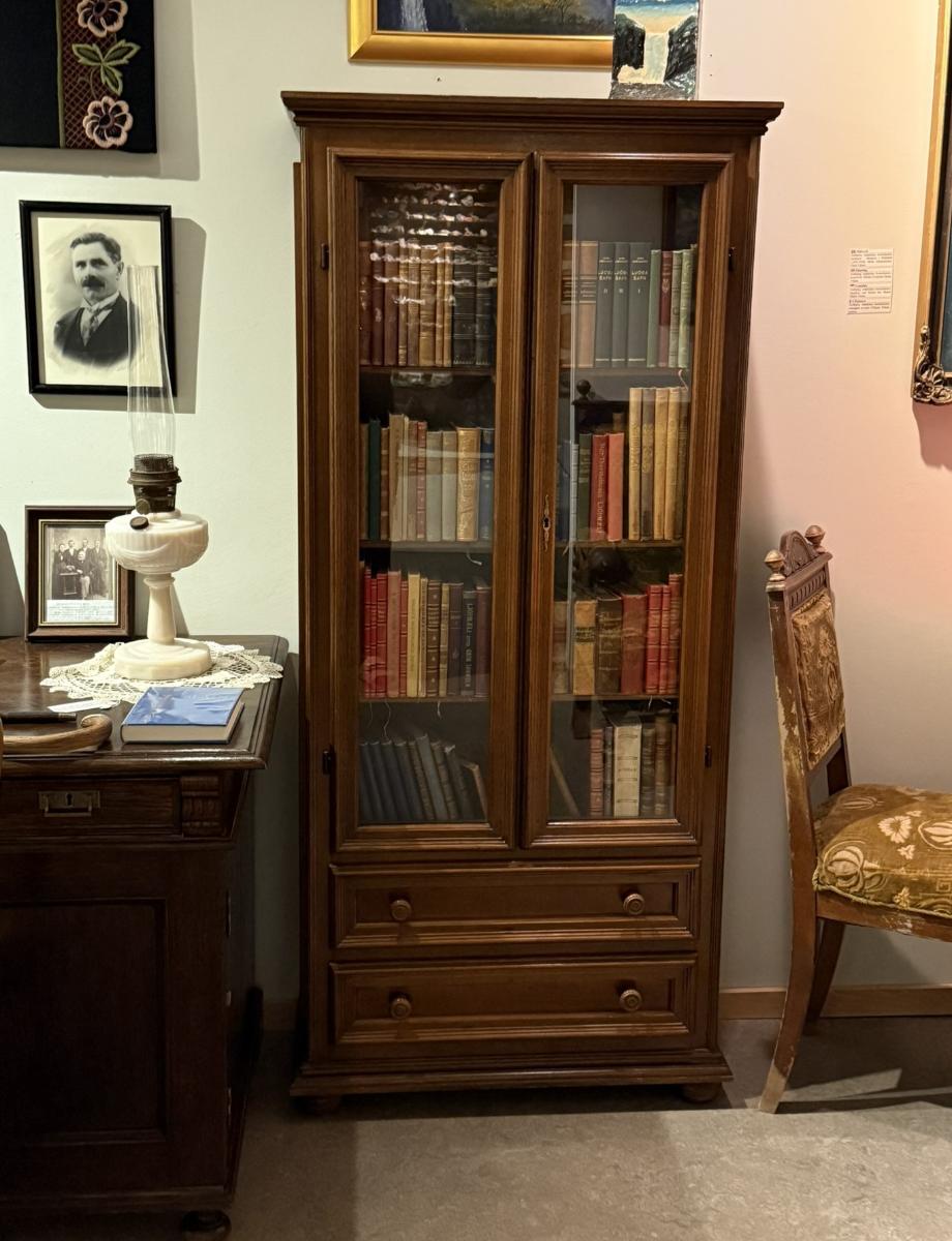 Bókaskápur úr eik, er með vængjahurðum og glerrúðum og tvær skúffur að neðan. Einnig mjög vönduð smíði. Hæð 1,65 m, breidd 74 cm. Gjöf systranna Hjördísar og Droplaugar dætra Guðmundar Guðmundssonar skólaskálds og konu hans, Ólínu Þorsteinsdóttur. Minjagripir úr búi þeirra hjóna. Guðmundur var fæddur að Hrólfsstaðahelli í Landsveit 1874, dáinn 1919. Gjöf þeirra systra kom að Skógum árið 2001. Ólína keypti skápinn nýjan eftir andlát Guðmundar. Í honum er safn ljóðabóka úr eigu Guðmundar, m.a. ljóðasafn hans. Í safninu eru ýmsar fágætar útgáfur frá 19. öld. Það er enn óskráð.
