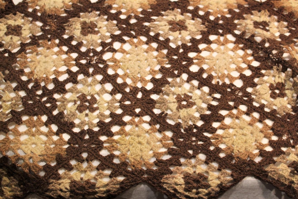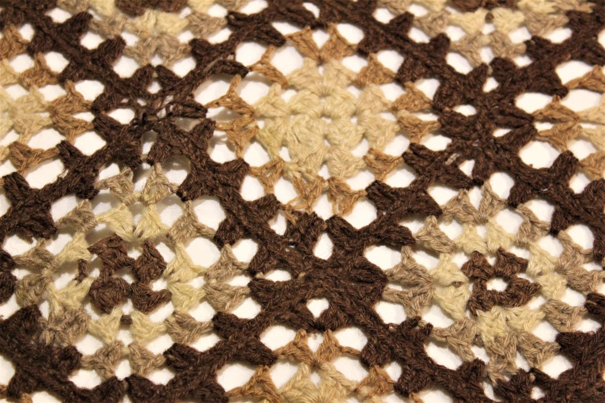 Heklaðar hlífar af húsgögnum (stólörmum). Efni er ullarband í sauðarlitum. Verk Guðbjargar Gunnarsdóttur. Hlífarnar eru þrjár, 2 stk 75x40 cm og 1 stk 76x30.