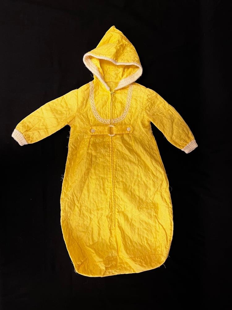 Kerrupoki með hettu, úr gulu efni, með rennilás og spæl framan á.