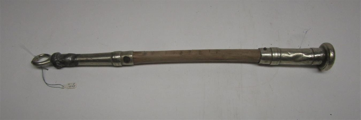 Silfurbúið svipuskaft. Á bréfmiða, er svipunni fylgir, segir að talið sé að Hermann Jónasson alþingismaður Húnvetninga haf átt hana. Skúli Jónsson sendi