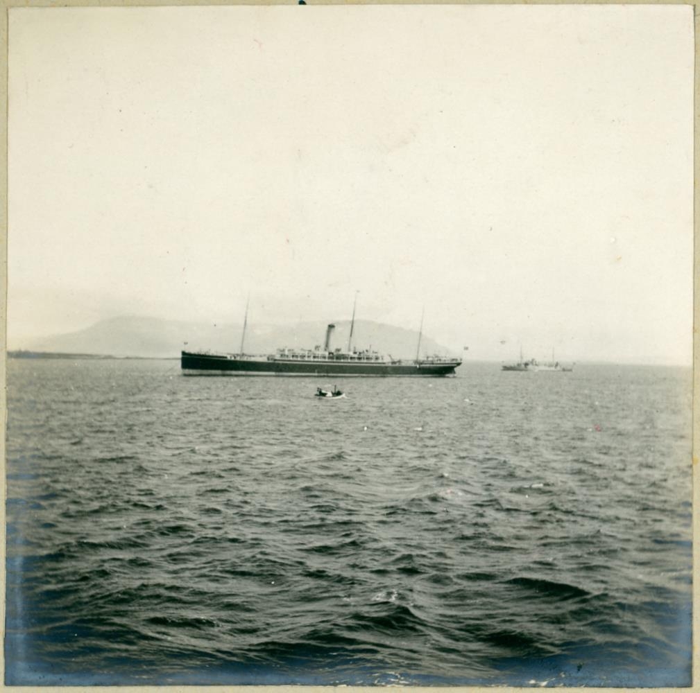 Þingmannaskipip Atlanta e/s, á legunni við Reykjavík. Sér í Engey framan við stefni skipsins. Fjær t.h. sér í eitt fylgdarskipanna.