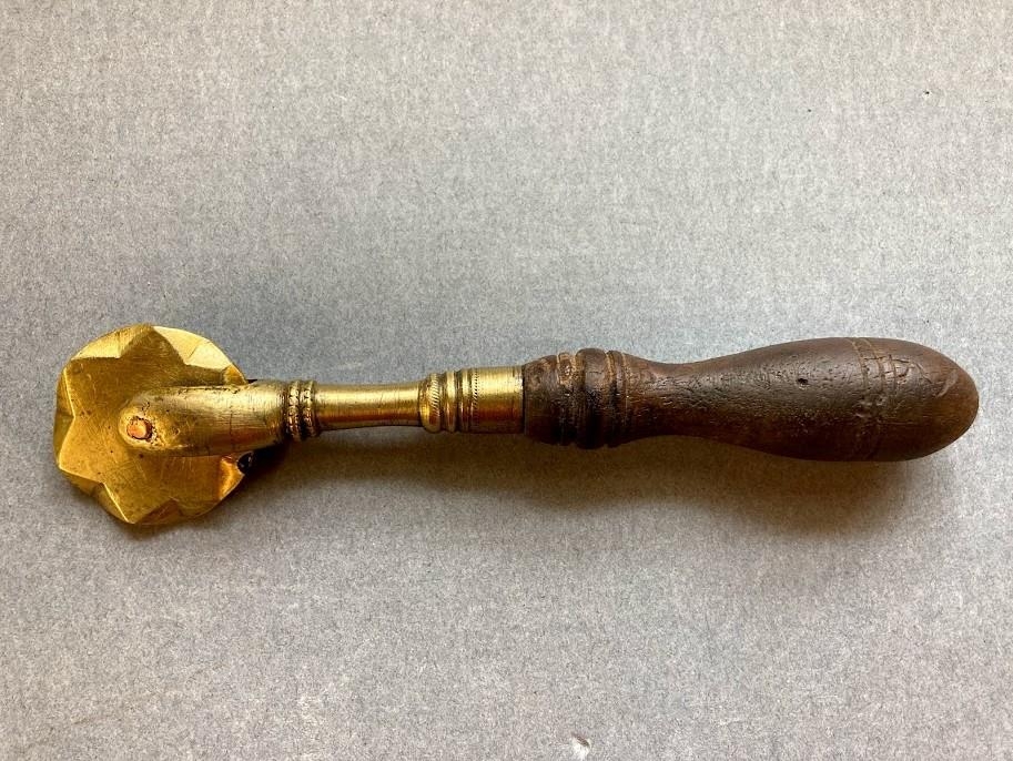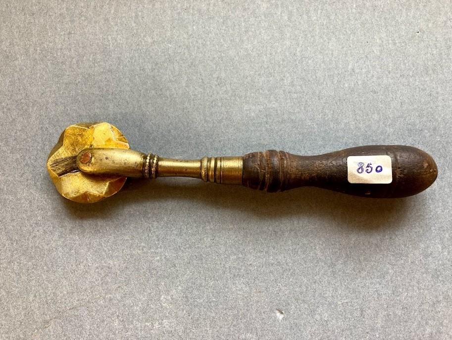 "Kleinujárn" úr kopar, með renndu mahognyskafti. Hjól vantaði, er sett á af Þórði Tómassyni. Á skafti er fangamark Þuríðar Vigfúsdóttur í Efra-Hólakoti. Þessi gripur er smíðaður af afa hennar, Jóni Jónssyni á Lambafelli.