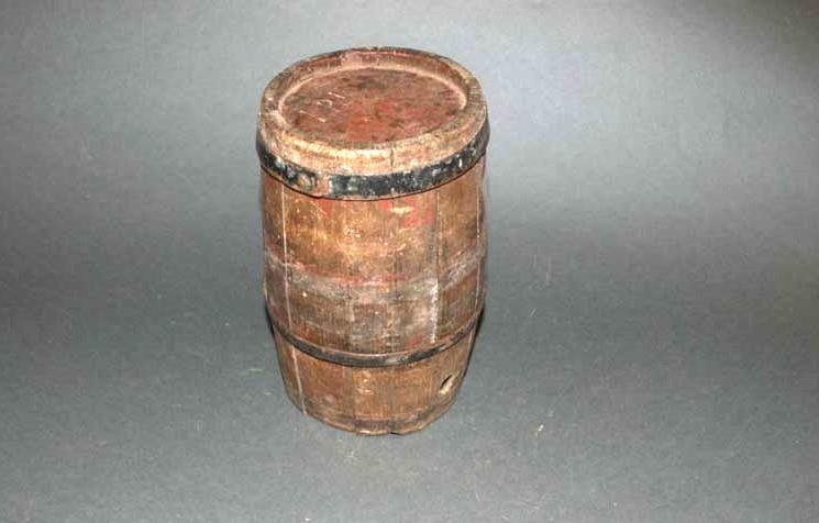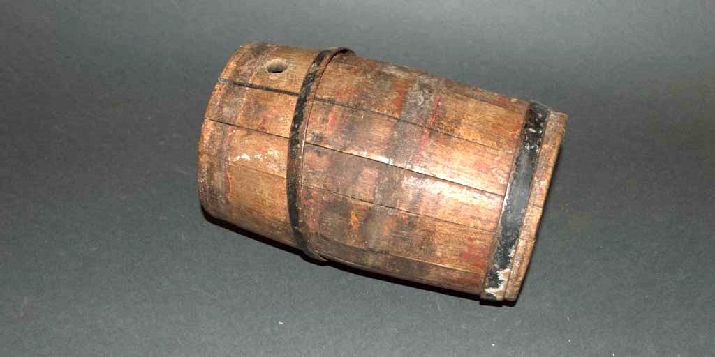 Lítill brennivínskútur, eða kaffikútur, um tveggja potta, 19 sm. á hæð; þverm. um botn 11 sm. 14 stafir, hefur verið rauðmálaður. járngirtur, eina gjörð vantar. Merktur: I.P.J.