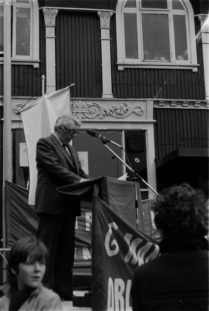 Útifundur. Sennilega 1. maí 1981. Félag bókagerðarnema og Félag járniðnaðarnema standa fyrir útifundi á Hótel-Íslandsplaninu/Hallærisplaninu. Karlmaður stendur við ræðupúlt og flytur ræðu. Sennilega Pétur Pétursson, útvarpsmaður.
