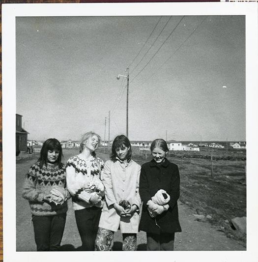 Frænkur ættaðar frá Vörum í Garði að koma frá sundnámskeiði í sundhöll Keflavíkur. Farið var til og frá Keflavík með áætlunarrútu sem fór hring um Suðurnes með reglulegu millibili. Stoppustöð rútunnar í Inn-Garði var við Garðstaði og þar er myndin tekin árið 1969. Frá vinstri: Jóhanna Amelía Kjartansdóttir frá Bjarmalandi, Stefanía Vilhjálmsdóttir frá Brekku, Kristjana Vilborg Einarsdóttir frá Silfurtúni og Kristjana Oddný Þorsteinsdóttir frá Borg, allar búsettar í Garði á þessum tíma.