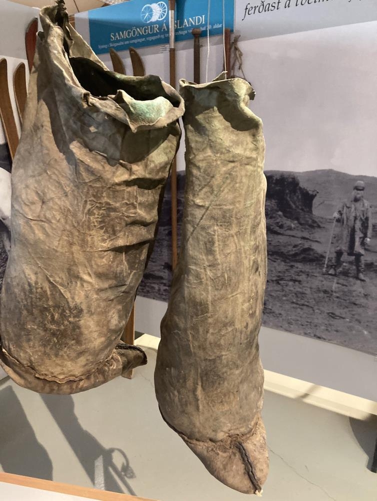 Skinnsokkur, saumaður af Jóni Runólfssyni á Hárlaugsstöðum. Troðnir úr með heyi að gömlum hætti.