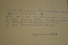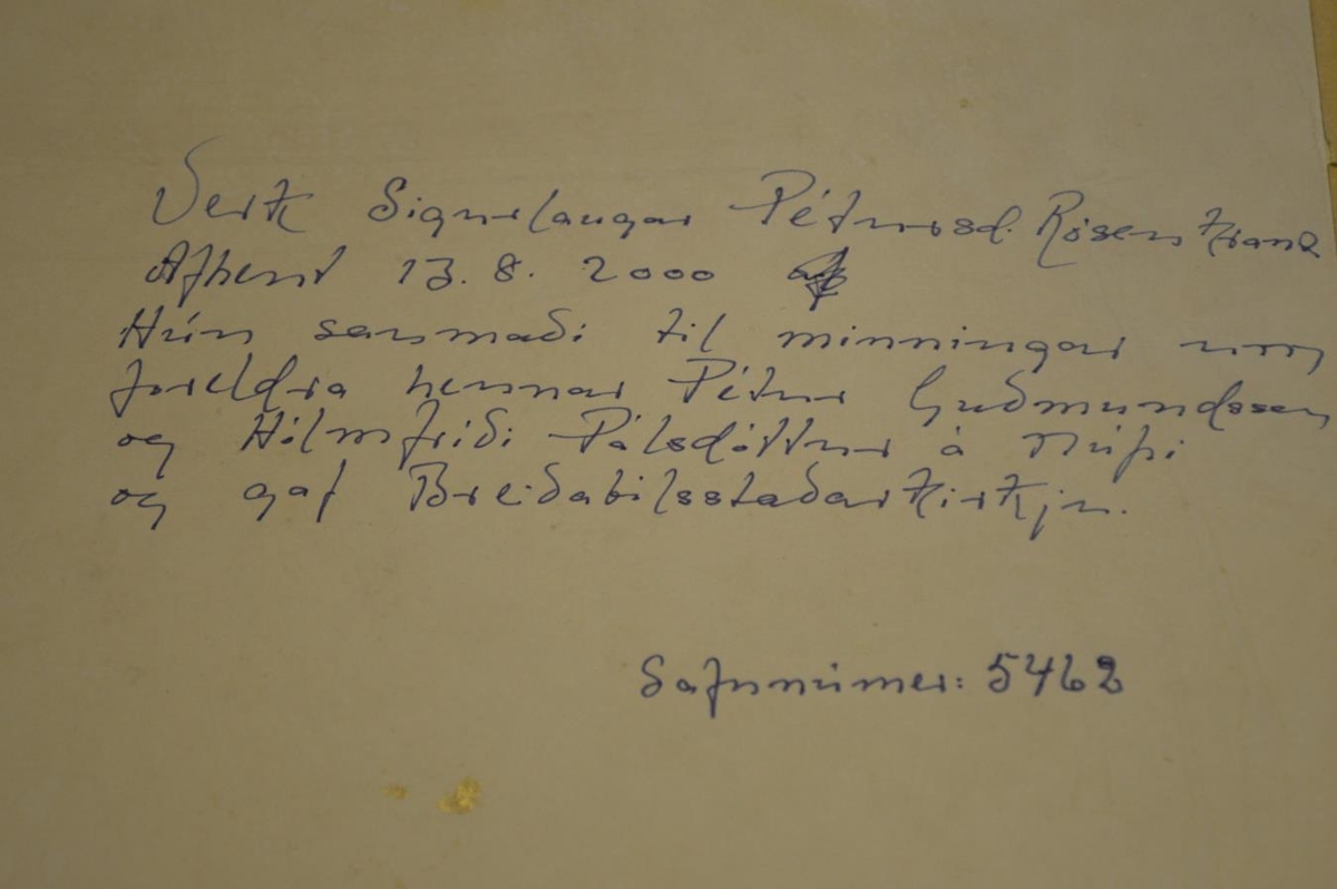 Útsaumuð, innrömmuð mynd, í gylltum ramma,stærð 36,5 x 32,5 cm. Gulleitur útsaumur í svartan "stramma". Skreytið er jurtasveigur, tvær blaðgreinar neðan frá og mætast í toppinn ofan við miðju. Hefur orðið fyrir skemmdum, helmingur fjögurra blaða er horfinn. Sigurlaug Pétursdóttir Rósenkrans saumaði til minningar um foreldra sína, Pétur Guðmundsson á Núpi og Hólmfríði Pálsdóttur og gaf Breiðabólstaðarkirkju. Þar lá verkið síðar í hirðuleysi og skemmdist. Guðrún Pétursdóttir á Núpi, systir Sigurlaugar, bjargaði því frá glötun.