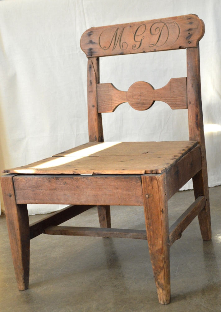Stóll Matthildar Guðmundsdóttur á Dyrhólum með fangamarki hennar; M.G.D.