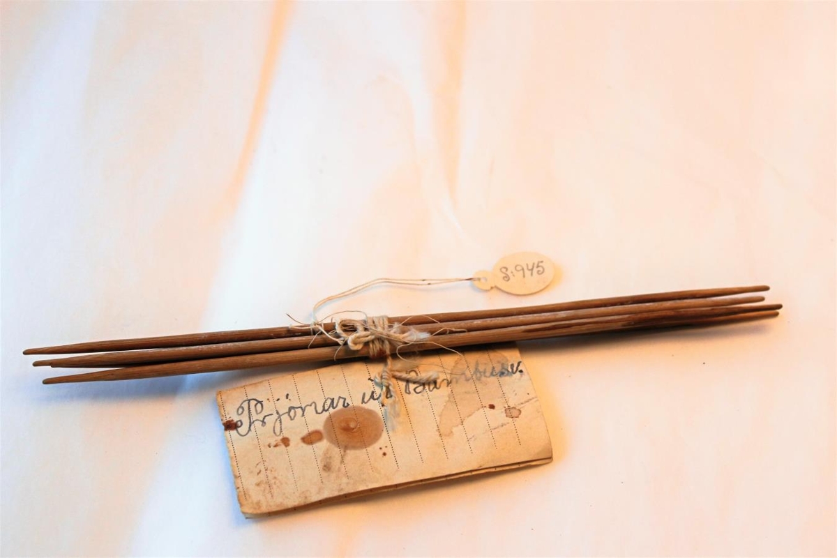 Bandprjónar, smíðaðir úr bambus. 4 eru 20,5 cm og 1 er 16,5 cm. Gefið af frú Elínu Þorsteinsdóttur frá Dyrhólum.