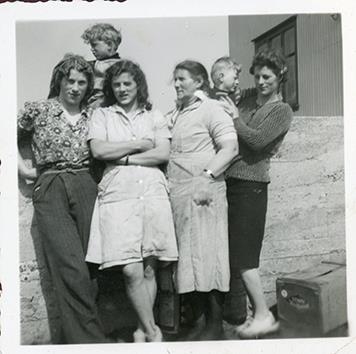 Systurnar frá Vörum í Garði með móður sinni, Kristjönu fyrir framan Varir. Frá vinstri: Elísabet Vilborg Halldórsdóttir, Karitas Hallbera Halldórsdóttir, Kristjana Pálína Kristjánsdóttir og Guðrún Halldórsdóttir. Guðrún heldur á syni sínum, Helga Pálmari Breiðfjörð og systursonur þeirra, Þórður Kristinn Kristjánsson sonur Halldóru Halldórsdóttur, situr á garðveggnum.