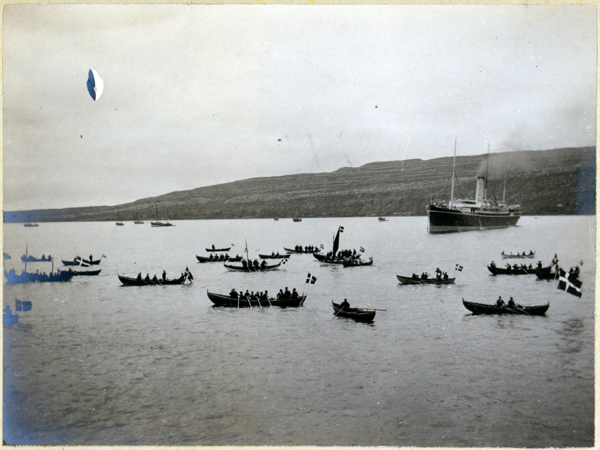 Fjöldi árabáta og eitt skipanna í fylgdarliði Konungs, sennilega við Færeyjar.