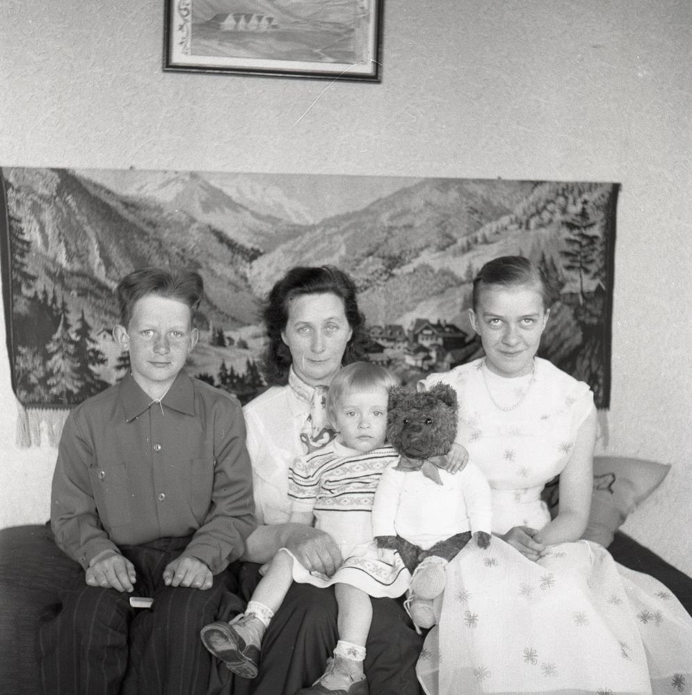 Kristjón Sigurðsson, Ásthildur (Ásta) Magnúsdóttir situr með Láru Sigurðardóttur og Hólmfríður Sigurðardóttir í Tjaldanesi í Saurbæ.