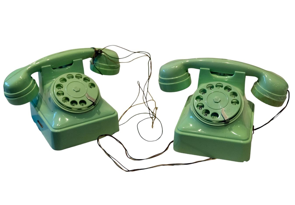 Tveir leikfangasímar, ljósgrænir að lit. Hægt var að tala á milli símanna.