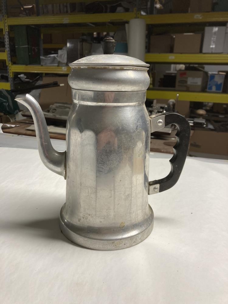 Kaffikanna úr áli. Kaffipoki fylgir. Hald og töpp í loki úr öðru efni, svört að lit. Hæð um 25 cm. Margir hafa þegið kaffi úr þessari könnu hjá hinni gestrisnu húrfreyju, Sveinbjörgu. Úr búi Sveinbjargar Ásmundsdóttur og Guðmundar Erasmussonar á Syðri-Fljótum.
