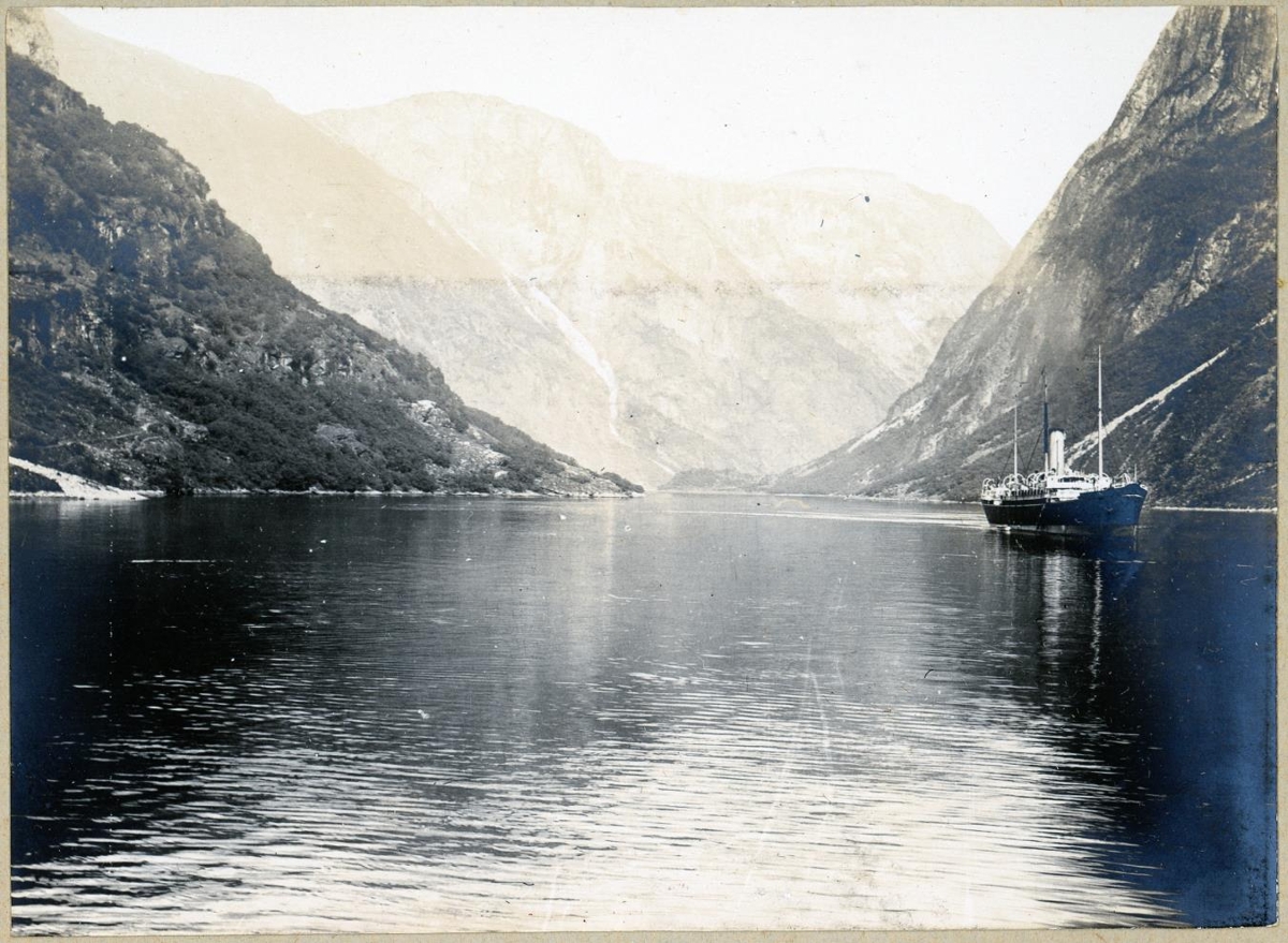 Líklega þingmannaskipið e/s Atlanta á siglingu í norskum firði.