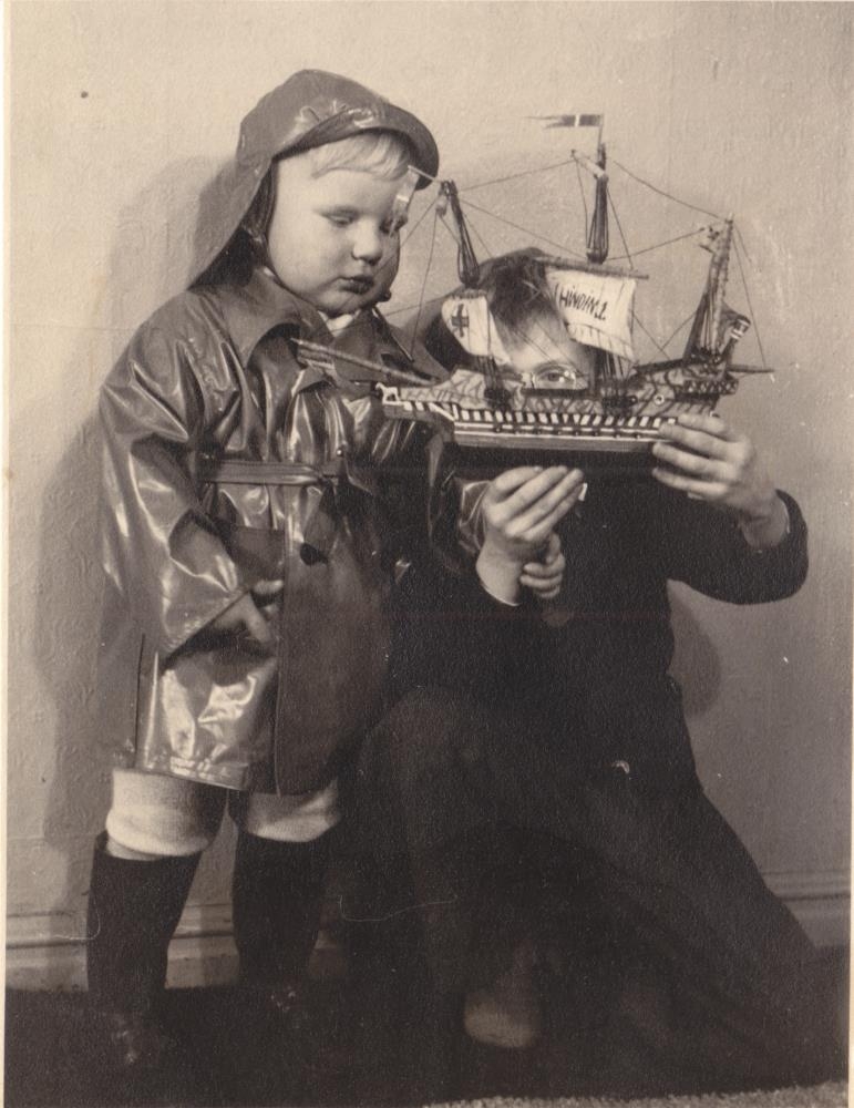 Tveir drengir virða fyrir sér líkan af þriggja mastra flagg skipi. Annar drengurinn í dökkum fötum og tillir sér á kné. Hinn í stígvélum, regnfrakka og með sjóhatt.