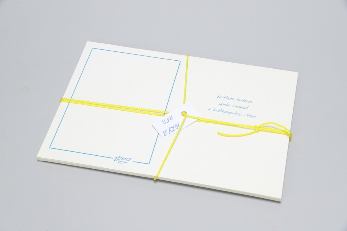 Bunki af brúðkaupskortum, hvít með blárri rönd. Texti: Þökkum innilega sýnda vinsemd á brúðkaupsdaginn okkar.