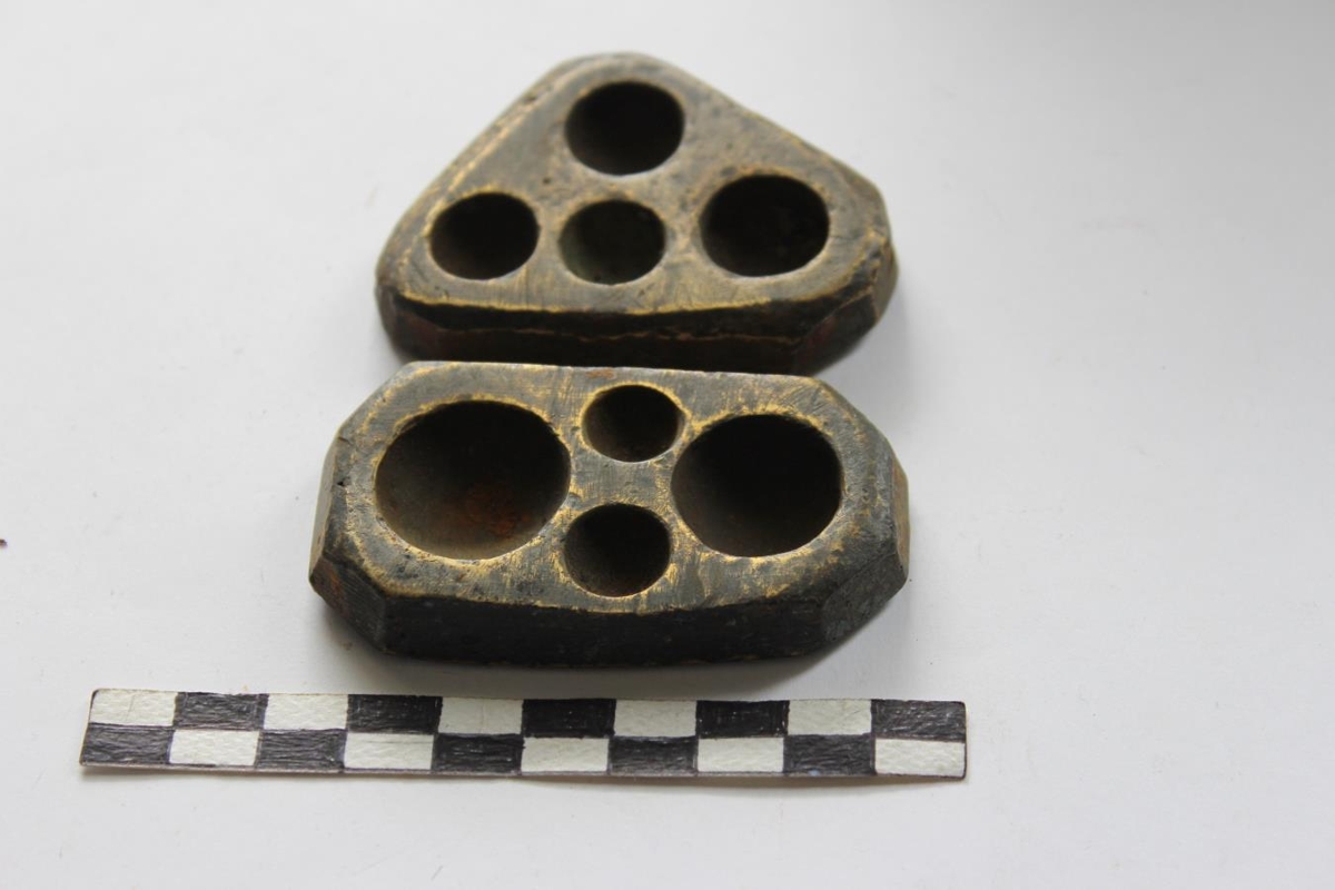 Tvenn koparmót, óvíst til hvers (hnappamót?). Gefið af Ólafi Sveinssyni í Botnum í Meðallandi minjar frá koparsmíði afa hans, Steingríms Jónssonar á Fossi á Síðu (1829-1923)
