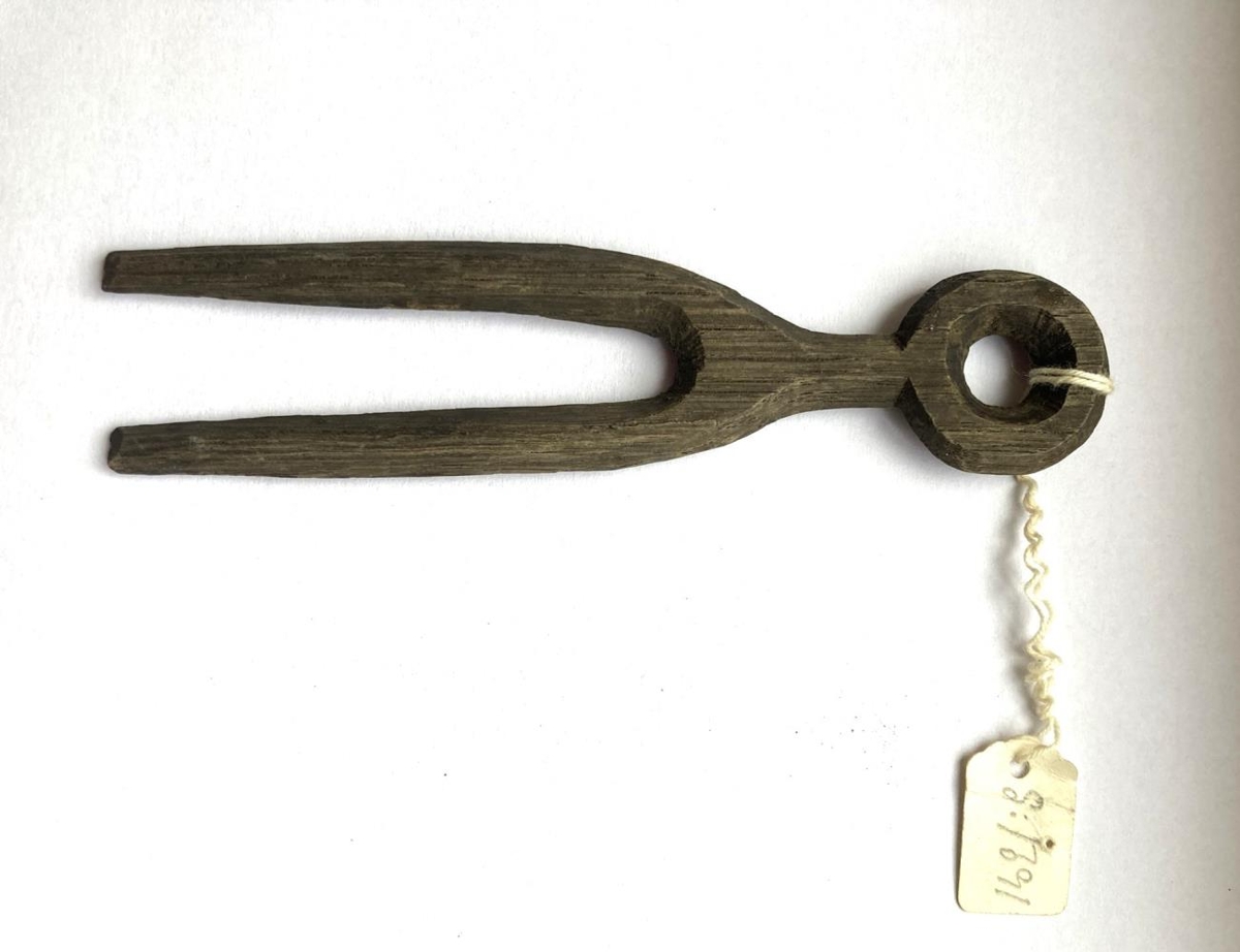 Trémót. Kynni að vera að gaffli til hannyrða (við að gimba). Gefið af Ólafi Sveinssyni í Botnum í Meðallandi minjar frá koparsmíði afa hans, Steingríms Jónssonar á Fossi á Síðu (1829-1923)