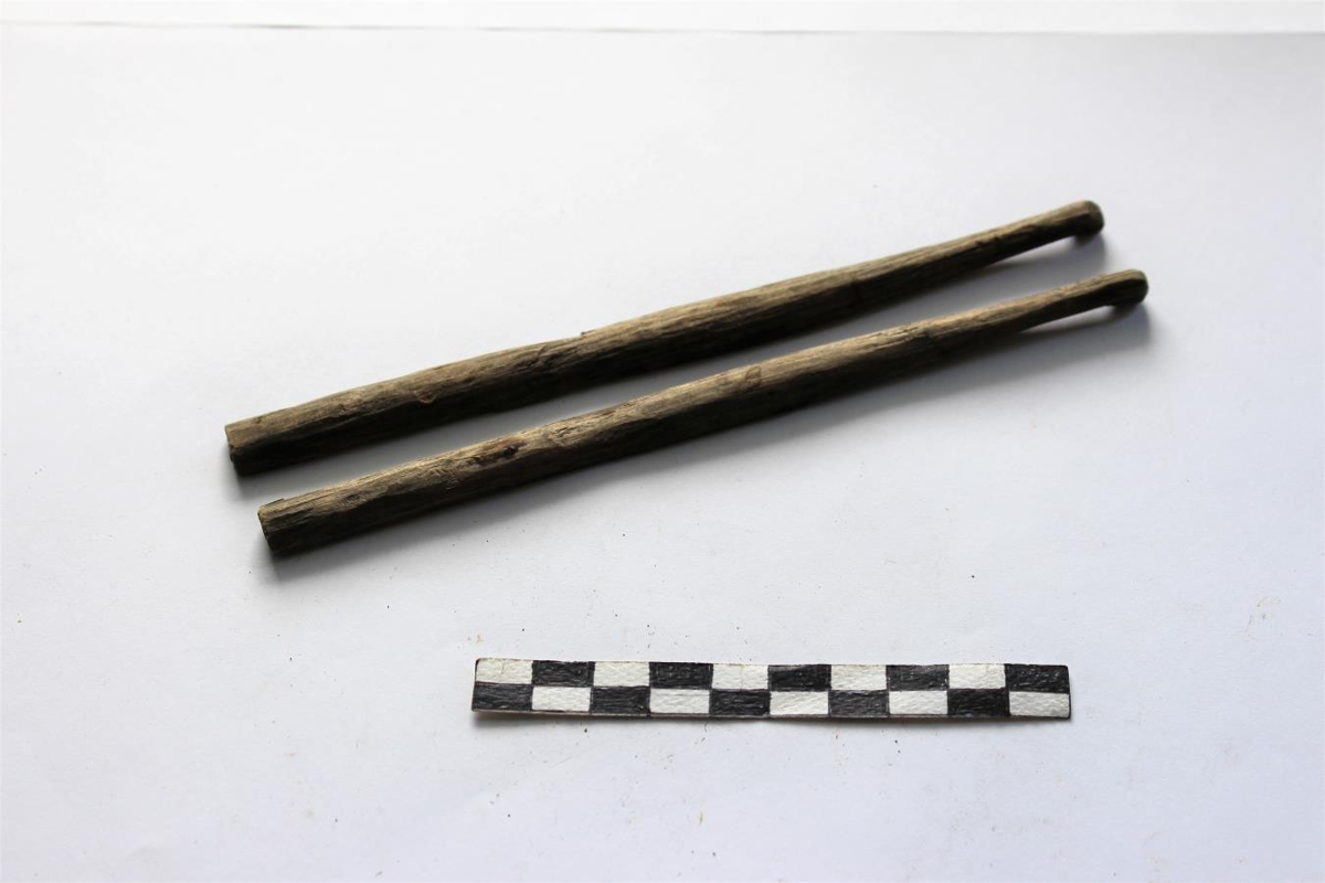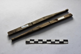 Trémót, óljóst til hverra nota, tvískipt. Gefið af Ólafi Sveinssyni í Botnum í Meðallandi minjar frá koparsmíði afa hans, Steingríms Jónssonar á Fossi á Síðu (1829-1923).