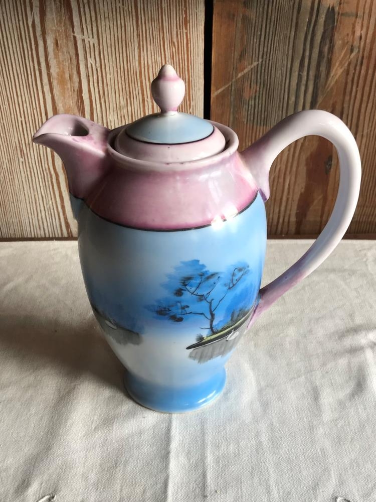 Kaffikanna úr postulíni, kínversk eða japönsk. (Svanur á vatni, tré á vatnsbakka).