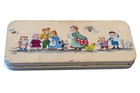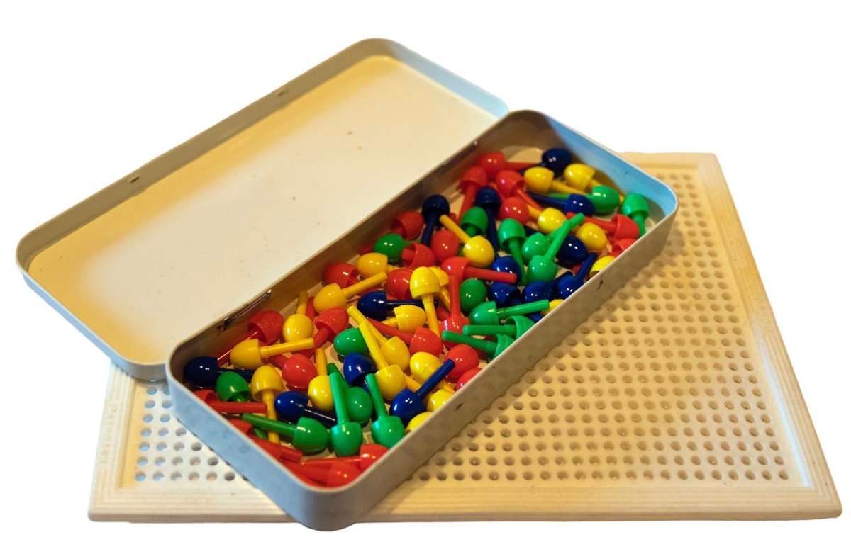 Pinnar (gulur, rauður, grænn og blár) í blikkboxi og grind til að raða pinnum á.