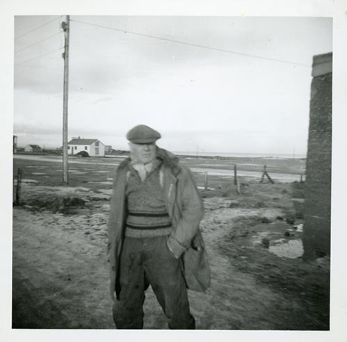 Eyjólfur Kristinn Eyjólfsson frá Lónshúsum í Garði. Hlaðan í Nýlendu í Garði í baksýn. (28.07.1883 – 27.07.1970) Myndin er líklega tekin í kringum árið 1960.