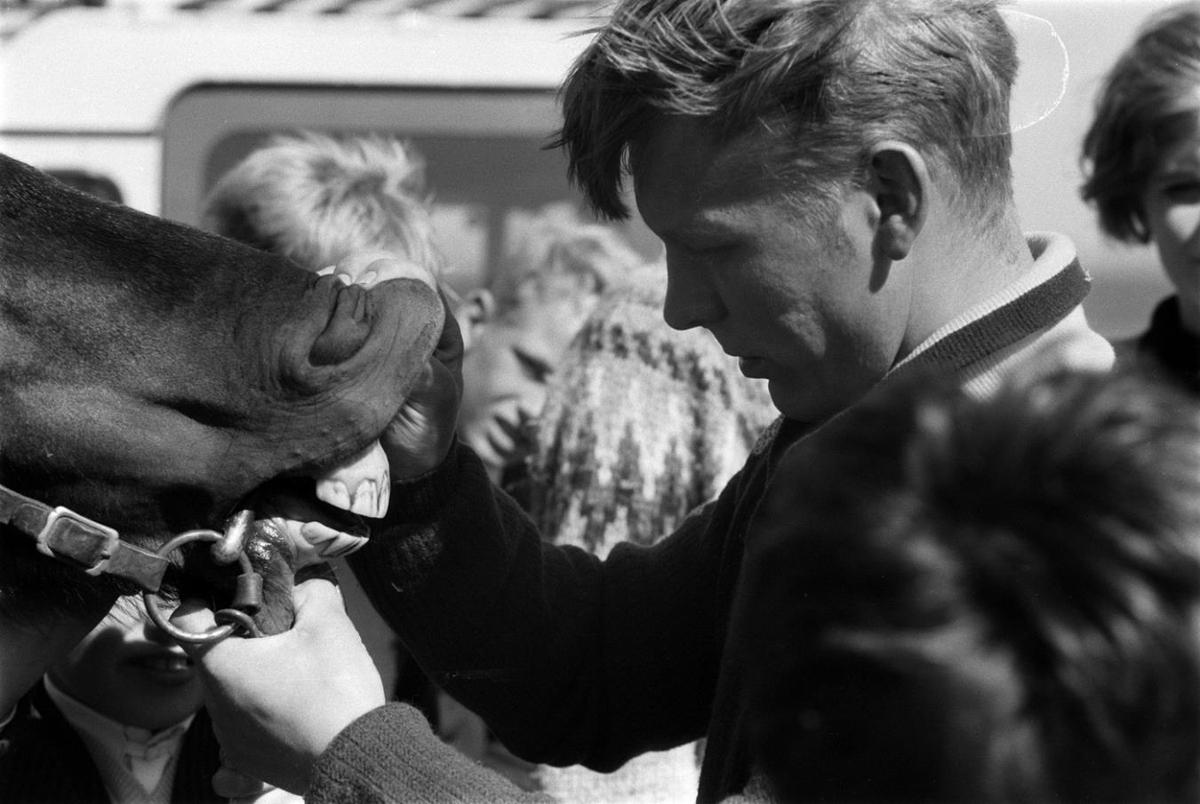 Árnessýsla. Bláskógabyggð. Landsmót UMFÍ Laugarvatni 3.- 4. júlí 1965. Karlmaður dæmir hest.