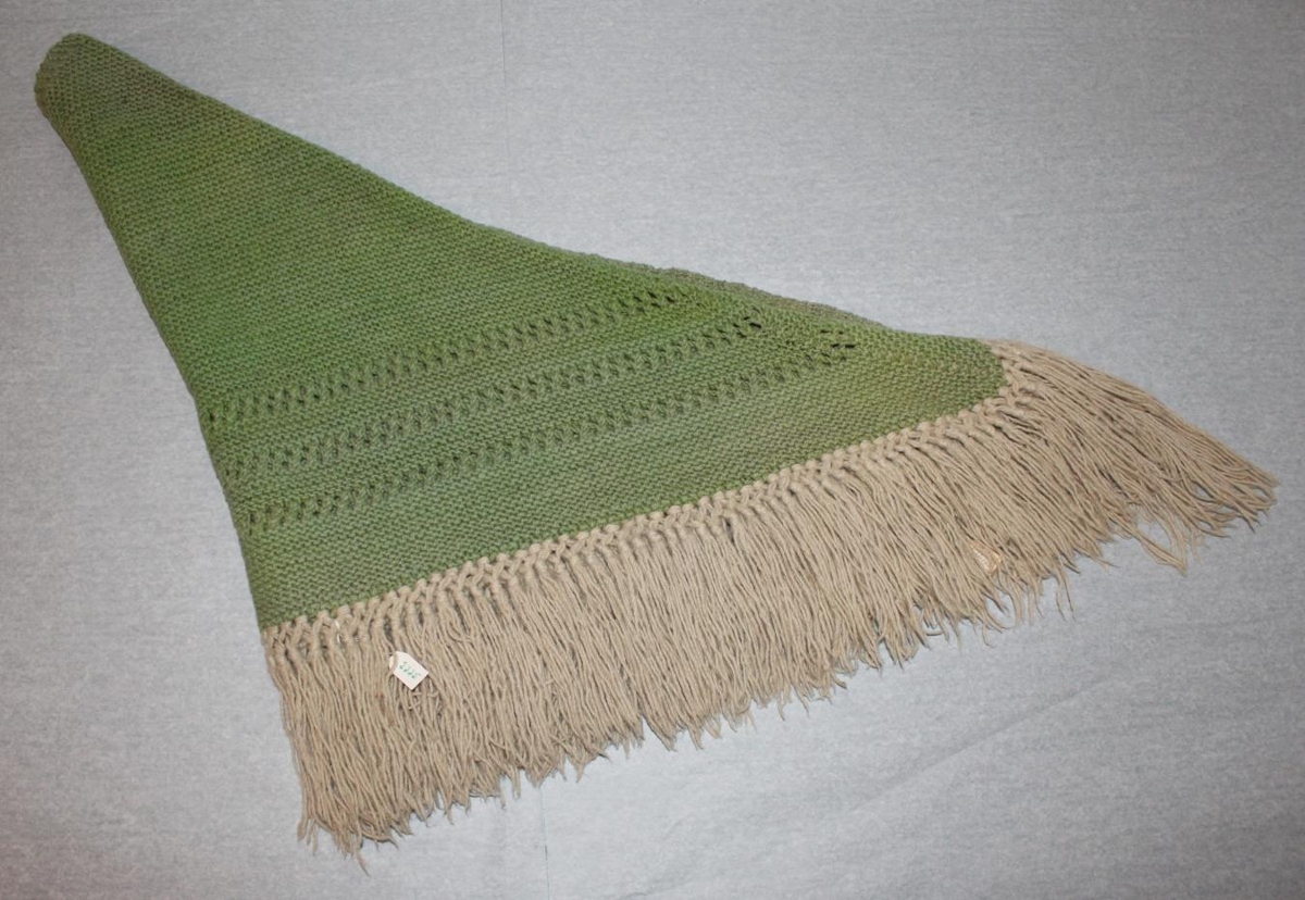 Hyrna, prjónuð, græn að lit, með hvítu kögri. Verk Guðrúnar Gísladóttur.