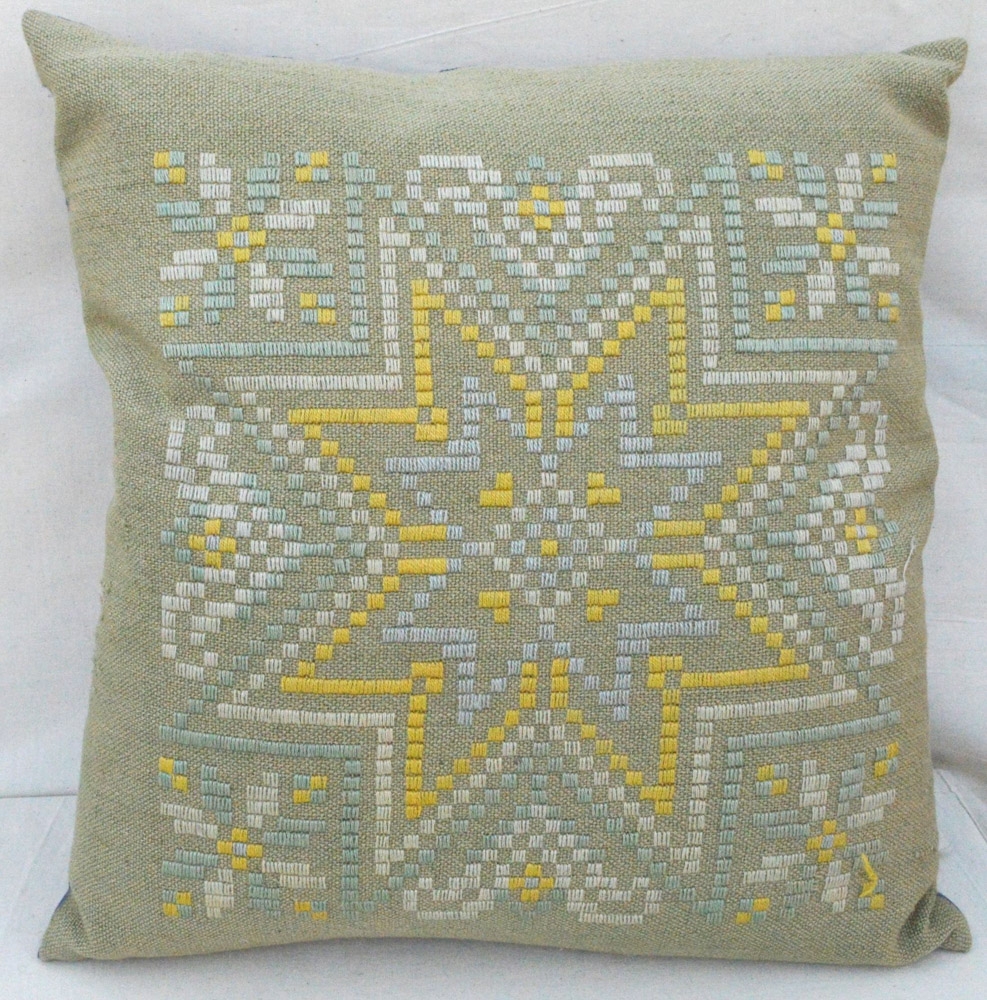 Púði með góbelínsaum, áttblaðarós saumuð í græna einskeftu. Upplitað. Stærð 44 x 41 cm. Óvíst hvort verk Bergþóru eða Sigurbjargar.